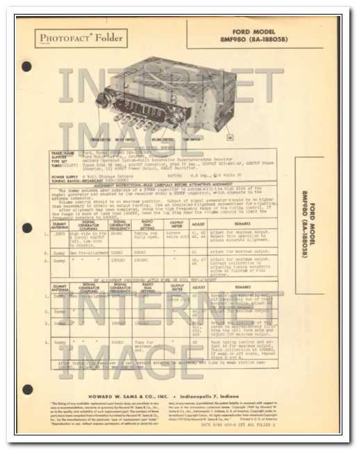 Vintage FORD model 8MF980 (8A-18805B) 8 tube Superheterodyne AM car radio receiver. Original old Sams Photofact manual includes schematic, layouts, alignment info, repair parts list. 5 pages. Dated 1949. Ford Motor Car Company of Detroit, MI. This manual would make a sensational accompaniment to your vintage audio equipment.