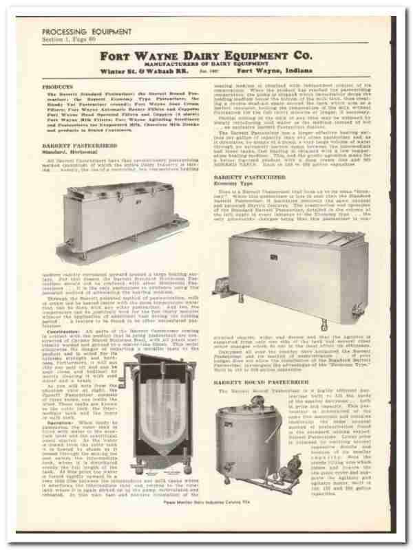 Products include Barrett Pasteurizers standard & horizontal, Economy Type Barrett Pasteurizer, Barrett Round Pasteurizer, Handy Vat, Fort Wayne Sour Cream Filter, Fort Wayne Agitating Sterilizer, Fort Wayne Fillers and Cappers, all are fully featured.