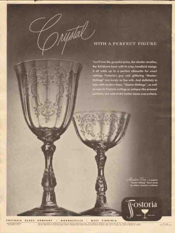 Original home glassware industry trade magazine vintage ad for FOSTORIA GLASS COMPANY of Moundsville, VA. Crystal With a Perfect Figure. Meadow Rose Master Etching hand made by skilled American craftsmen. Old 1946 glass goblets magazine advertisement. This ad would display beautifully matted and framed.