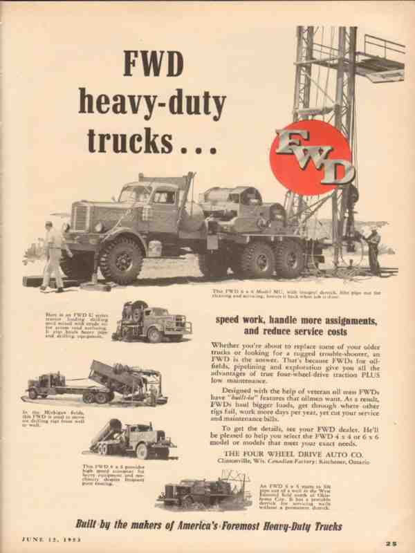 four wheel drive auto company 1953 right oil men fwd truck vintage ad