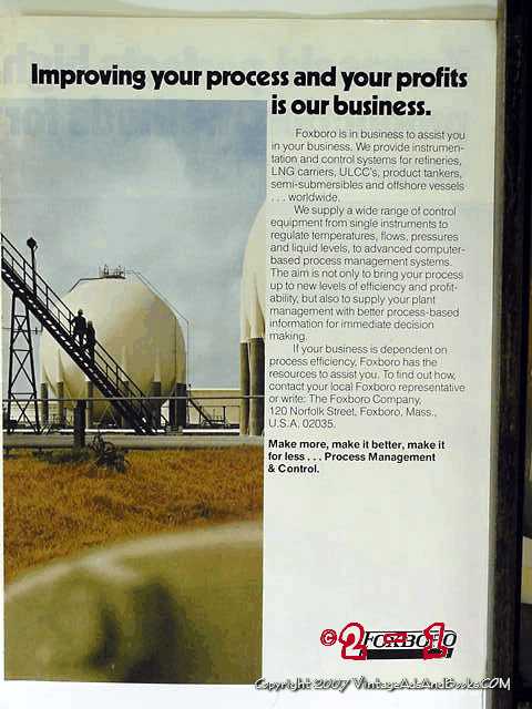 Original oil and gas trade magazine vintage ad for THE FOXBORO COMPANY. Main office and factory was located at 120 Norfolk Street, Foxboro, MA. Instrumentation and control systems for refinery, LNG carriers, ULCC's, product tankers, semi-submersibles and offshore vessels worldwide. Improving your process and your profits is our business. Unique 1977 old petroleum refinery industry magazine advertisement. Approximate size 9 x 12 inches