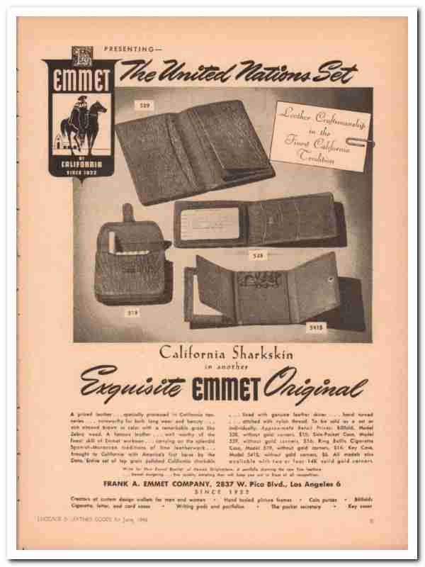 Original leather goods trade magazine vintage ad for FRANK A. EMMET COMPANY. Main office and factory was located at 2837 West Pico Blvd, Los Angeles, CA. Manufacturers of wallets and billfolds. The United Nations Set is featured. California Sharkskin in another Exquisite Emmet Original. This unique 1946 old leather industry magazine advertisement would display wonderful matted and framed. Nice graphics.