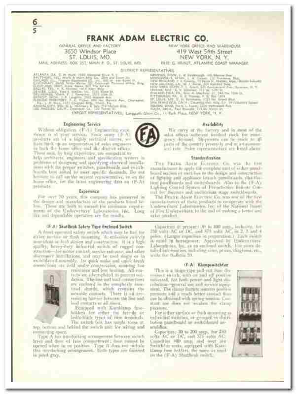 Original 1941 electrical trade vintage catalog for the FRANK ADAM ELECTRIC COMPANY. Main office and plant was located at 3650 Windsor Place, St Louis, MO.