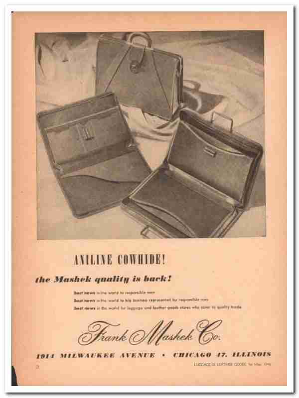 Original leather goods trade magazine vintage ad for FRANK MASHEK COMPANY. Main office and factory was located at 1914 North Milwaukee Avenue, Chicago, IL. Manufacturers of Leather goods, brief bags and cases. Aniline Cowhide. The Mashek quality is back! This unique 1946 old leather industry magazine advertisement would display wonderful matted and framed. Nice graphics.