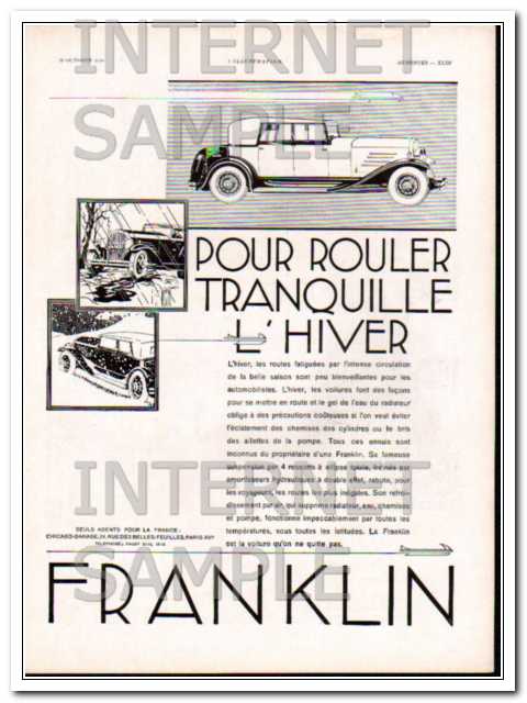 Original vintage French magazine ad FRANKLIN AUTOMOBILE COMPANY made in Syracuse, NY. Distributed in Paris, France. Travels quietly in winter snow and rain. This ad is written entirely in French. Old 1930 dated elite car advertisement. Would matte and frame beautifully.