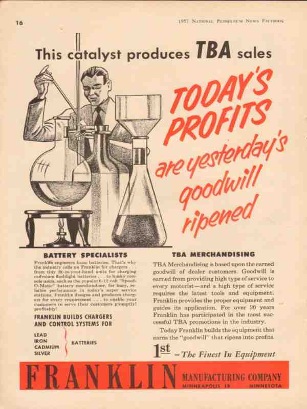 Original old retail petroleum trade magazine vintage ad for FRANKLIN MANUFACTURING COMPANY. Main office and factory was located in Minneapolis, MN. Battery Chargers and Control Systems. TBA Merchandising, Finest in Equipment. This unique old 1957 gasoline service station advertisement would display beautifully matted and framed.