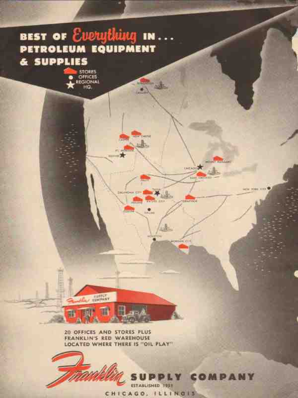 Original oil and gas trade magazine vintage ad for FRANKLIN SUPPLY COMPANY of Chicago, IL. Everything in Petroleum Equipment and Supplies. 20 Offices and stores plus Franklins Red Warehouse, Stores, and Offices. This unique 1955 old petroleum oilfield and refining process equipment magazine advertisement would display beautifully matted and framed. Nice graphics.
