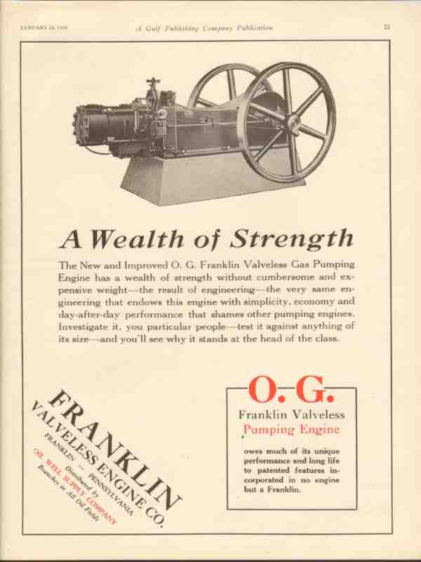 Original oil and gas trade magazine vintage ad for FRANKLIN VALVELESS ENGINE COMPANY of Franklin, PA. A Wealth of Strength in The New and Improved O.G. Franklin Valveless Gas Pumping Engine. Unique 1930 old oilfield petroleum pumping industry magazine advertisement.