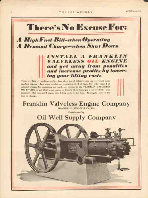 Original oil and gas trade magazine vintage ad for FRANKLIN VALVELESS ENGINE COMPANY of Franklin, PA. There's No Excuse for A High Fuel Bill When Operating a Demand Charge. Install a Franklin Valveless Oil Engine and Get Away form Penalties and Increase Profits by Lowering Your Lifting Costs. This unique 1931 old oilfield petroleum well pumping equipment magazine advertisement would display beautifully matted and framed. Nice graphics.