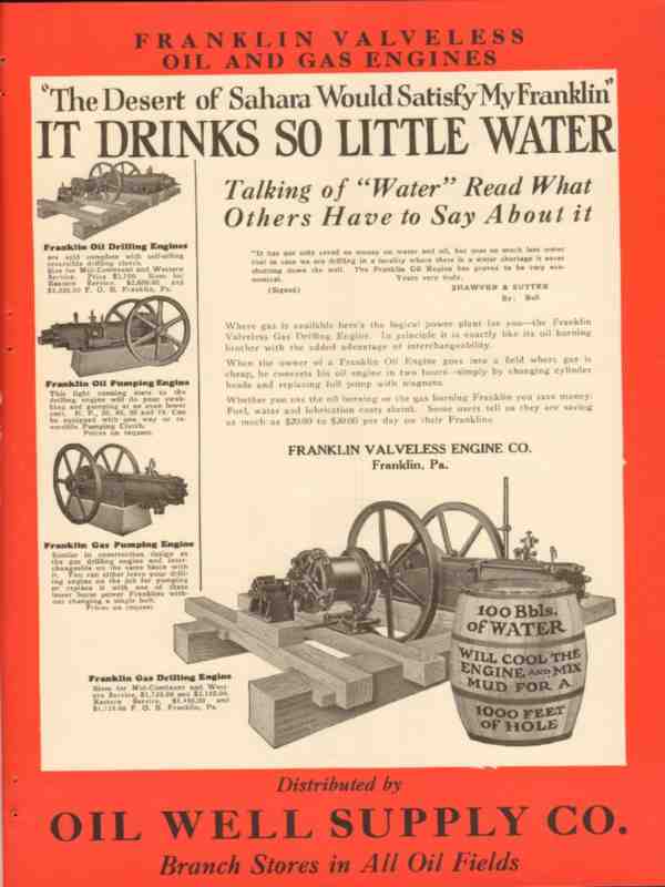 Original oil and gas trade magazine vintage ad for FRANKLIN VALVELESS ENGINE COMPANY of Franklin, PA. The Desert of Sahara Would Satisfy My Franklin, It Drinks So Little Water. Letter by Shawver and Sutter. Franklin oil drilling and pumping engines. Unique 1928 old oilfield petroleum drilling and pumping equipment magazine advertisement.