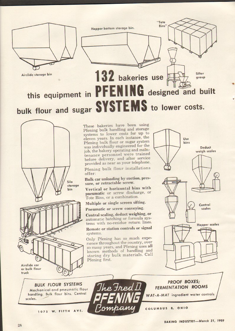 Original commercial bakery trade magazine vintage ad for FRED D. PFENING COMPANY in Columbus, OH. Bulk flour and sugar systems equipment to lower costs. Airslide storage bin, hopper bottom bins, central scales, hopper scales. 1959 unique old baking industry advertisement.