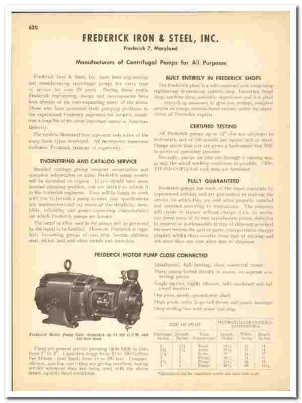 'Frederick Iron & Steel Inc. have been engineering and manufacturing centrifugal pumps for every type of service for over 25 years. During those years, Frederick engineering, design and developments have kept abreast of the ever-expanding needs of the times'.