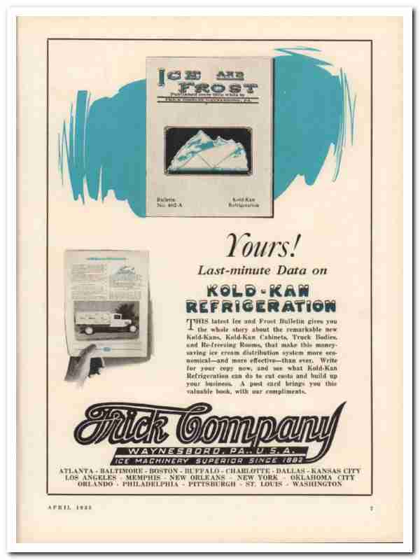 Original ice cream trade magazine vintage ad for FRICK COMPANY. Main office and factory was located in Waynesboro, PA. Manufacturers of Kold-Kan Refrigeration. Frost and ice bulletins give you the whole story about the remarkable new Kans, Cabinets, Truck Bodies and Re-freezing Rooms. This unique 1933 old dairy industry magazine advertisement would display wonderful matted and framed. Nice graphics.
