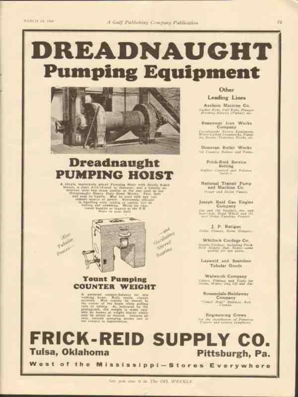 Original oil and gas trade magazine vintage ad for FRICK REID SUPPLY COMPANY. Main office and factory was located in Tulsa, OK and Pittsburgh, PA. Dreadnaught Pumping Equipment, Pumping Hoist and Counter Weight. Unique 1928 old oilfield petroleum pumping industry magazine advertisement. Slight crease down center, but will display beautifully matted and framed.