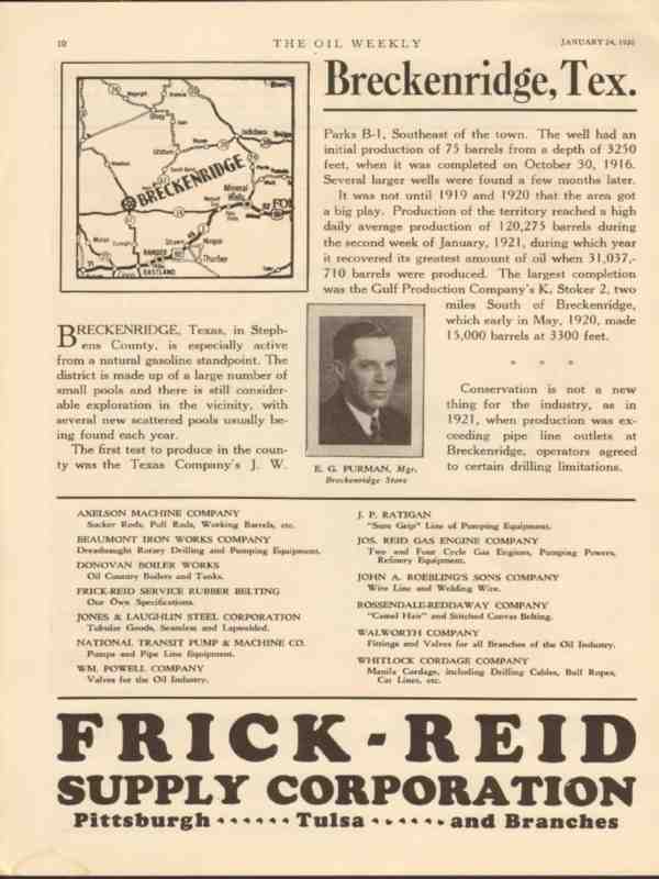 Original oil and gas trade magazine vintage ad for FRICK REID SUPPLY CORPORATION of Pittsburgh, PA. And Tulsa, OK. Pictured is Mr E.G. Purman, Manager of the Breckenridge, Texas Store in Stephens County. Texas Company's J. W. Parks B-1 oil well. Unique 1930 old oilfield petroleum equipment magazine advertisement.