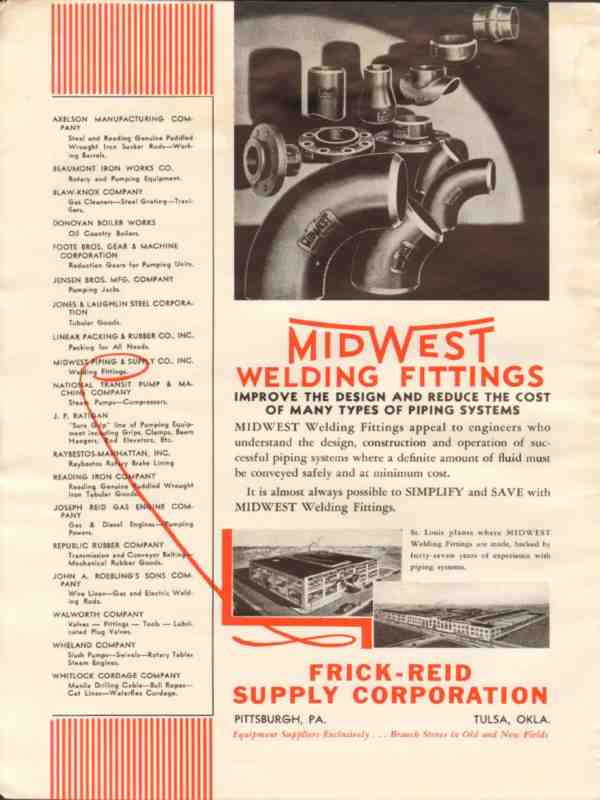 Original oil and gas trade magazine vintage ad for FRICK-REID SUPPLY CORPORATION of Pittsburgh, PA. and Tulsa, OK MidWest Welding Fittings Improve the Design of Many Piping Systems. This unique 1936 old petroleum oilfield piping equipment magazine advertisement would display beautifully matted and framed. Slight damp stain on outer page edge.