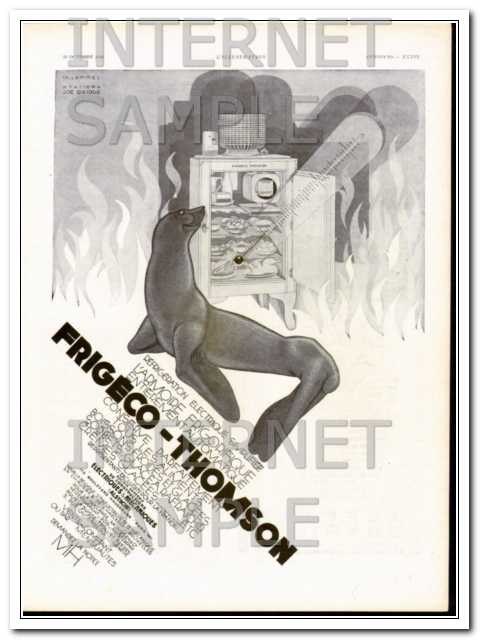 Original old elite French refrigerator magazine ad for FRIGECO-THOMSON of Paris, France. Frigeco Thomson Refrigerator Cabinet. Fully automatic, keeps perfectly all the food, cold drinks, frozen sorbet. Ch. Lemmel. Ateliers, Joe Bridge. Ad is written entirely in French. This 1930 French appliance advertisement would display beautifully matted and framed.