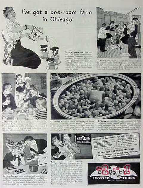 Original vintage magazine ad, FROSTED FOODS SALES CORPORATION.,of New York City, NY. I've Got A One Room Farm in Chicago. Old 1940 Birds Eye frozen food advertisement.