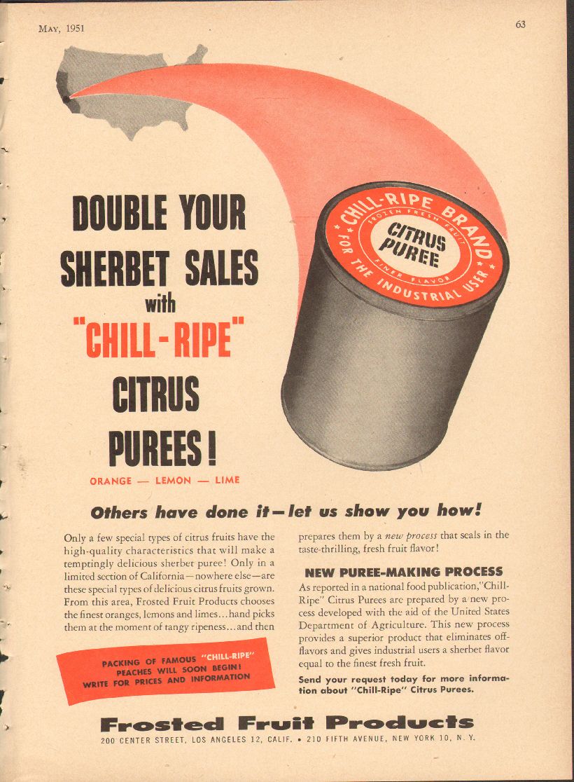 Original ice cream trade magazine vintage ad for FROSTED FRUIT PRODUCTS COMPANY. Offices were located in Los Angeles, CA and New York City, NY. Double Your Sherbet Sales with Chill-Ripe Citrus Purees! Orange, Lemon and Lime. This unique 1951 old dairy industry magazine advertisement would display wonderful matted and framed. Nice graphics.