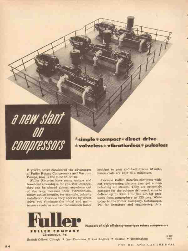 Original oil and gas trade magazine vintage ad for FULLER COMPANY of Catasauqua, PA. New Slant on Compressors. Fuller Rotary Compressors and Vacuum Pumps. This unique 1953 old petroleum gas equipment magazine advertisement would display beautifully matted and framed.