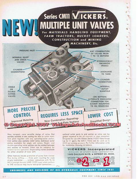 Original oil and gas trade magazine vintage ad for FULLER COMPANY of Catasauqua, PA. Texas Oil Company Uses Fuller Rotary Compressors for Sure, Pulse-Free Service. Unique 1955 old petroleum gas refinery industry magazine advertisement. On the reverse side is an ad for VICKERS INCORPORATED of Detroit, MI. Division of Speery Rand Corporation. Series CM11 Vickers Multiple Unit Valves for material Handling Equipment, Farm Tractors, Bucket Loaders, Construction and Mining Machinery, Etc. Engineers and Builders of Oil Hydraulic Equipment since 1921. Old 1955 petroleum industry equipment magazine advertisement. Approximate page size 9 x 12 inches.