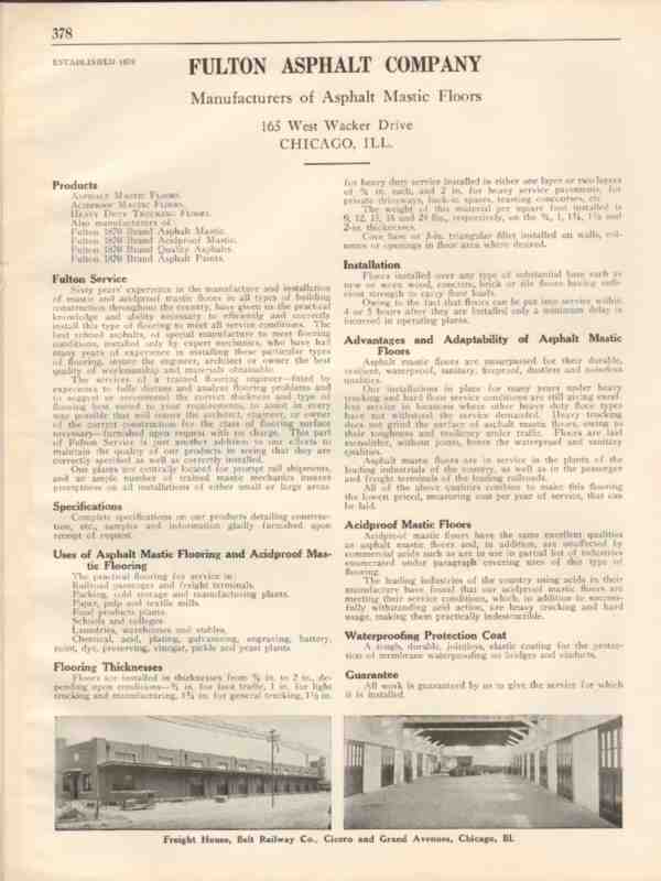 Original flooring trade vintage catalog for FULTON ASPHALT COMPANY. Main office and factory was located at 163 West Wacker Drive, Chicago, IL. Manufacturers of Acidproof Mastic Flooring. Used in railroad passenger, freight terminals, cold storage and manufacturing plants, paper, pulp and textile mills, food products plants, schools and colleges, laundries, warehouses and stables, chemical, acid and galvanizing plants. Disbound from a large 1931 floor materials catalog, this unique old two page technical specifications brochure would display wonderfully matted and framed. A marvelous addition to your retro flooring construction library. Slight damp stain on outer edge.