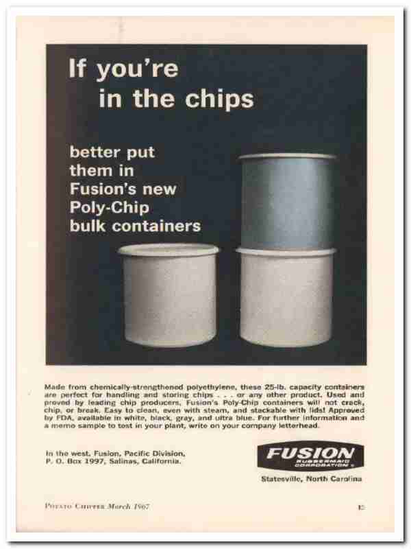 Original 1967 potato chip trade magazine vintage ad for FUSION RUBBERMAID CORP. Main office and factory was located in Statesville, NC. If you are in the chips, better put them in fusions new Poly-Chip bulk containers. Made from chemically-strenthened polyethylene, these 25-lb. capacity containers are perfect for handling and storing chips. This old dated one page food manufacturing magazine advertisement would display beautifully matted and framed.