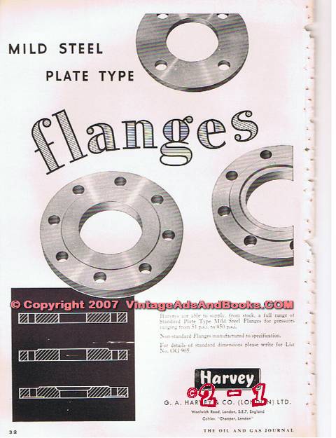 Original oil and gas trade magazine vintage ad for G. A. HARVEY & COMPANY, Ltd. Was located at Woolwich Road, London, S.E. England. Mild Steel Plate Type Flanges. This unique 1955 old oilfield petroleum drilling industry tools and equipment magazine advertisement would look sensational matted and framed. Nice graphics. Approximate size 9 x 12 inches.