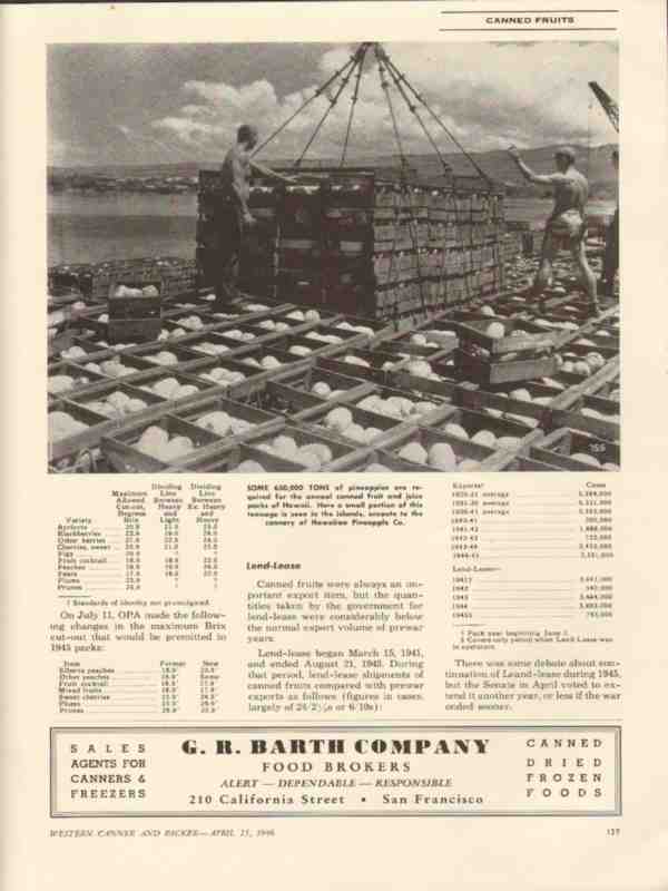 Original vintage food packing industry trade magazine ad for G. R. BARTH COMPANY of San Francisco, CA. Pineapples in route to the Cannery of Hawaiian Pineapple Company. Canned Fruit and Juice Packs of Hawaii. Lend-Lease Shipments of Canned Fruits Compared with Pre-War Exports Chart. Old 1946 canning and processing advertisement.