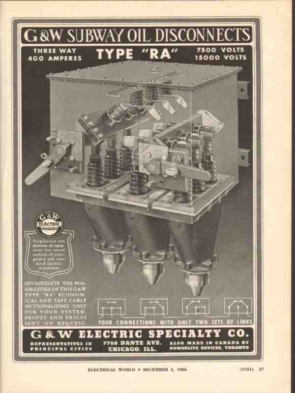 Original old electrical industry trade magazine ad for G AND W ELECTRIC SPECIALTY COMPANY. Main office and factory was located in Chicago, IL. Subway Oil Disconnects Type RA Three Way 400 Amperes. Economical and safe cable sectionalizing unit. This 1936 industry magazine advertisement would display beautifully matted and framed.