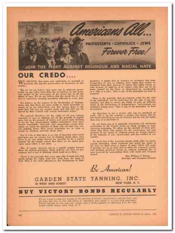 Original leather goods trade magazine vintage ad for GARDEN STATE TANNING, INC. Main office and factory was located at 22 West 32nd Street, New York City, NY. Americans All, Protestants, Catholics, Jews, Forever Free! Join the fight against religious and racial hate. Credo. This unique 1946 old leather industry magazine advertisement would display wonderful matted and framed. Nice graphics. Post World War II.
