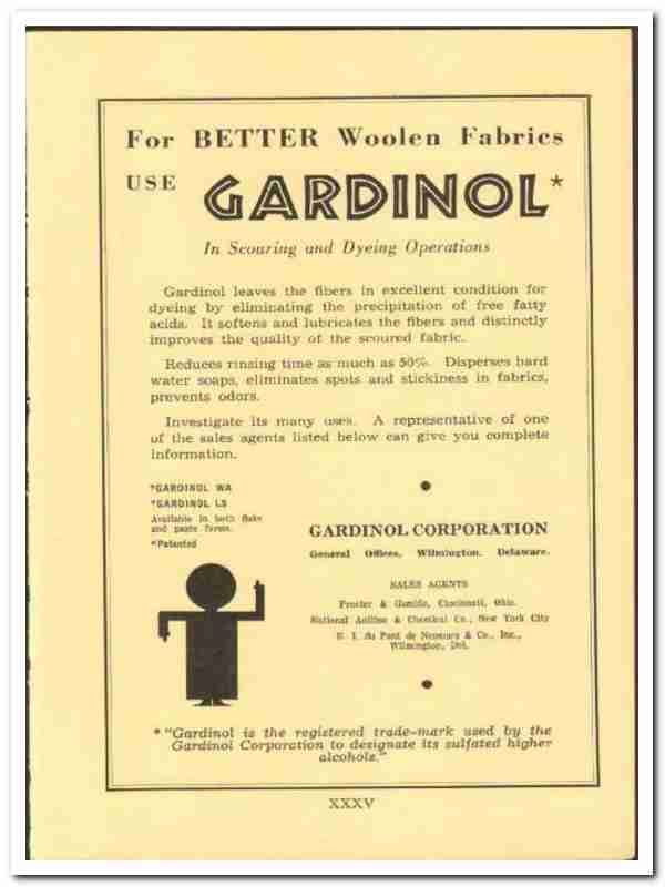 Gardinol Corp 1938 vintage chemical ad woolen fabrics dyeing scouring