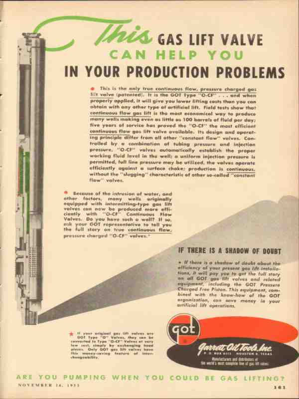 Original oil and gas trade magazine vintage ad for GARRETT OIL TOOLS, INC. of Houston, TX. This Gas Lift Valve Can Help You In Your Production Problems. Are You Pumping When You Could Be Gas Lifting? GOT Type O-CF Valves. Unique 1953 old oilfield petroleum pump industry equipment magazine advertisement.