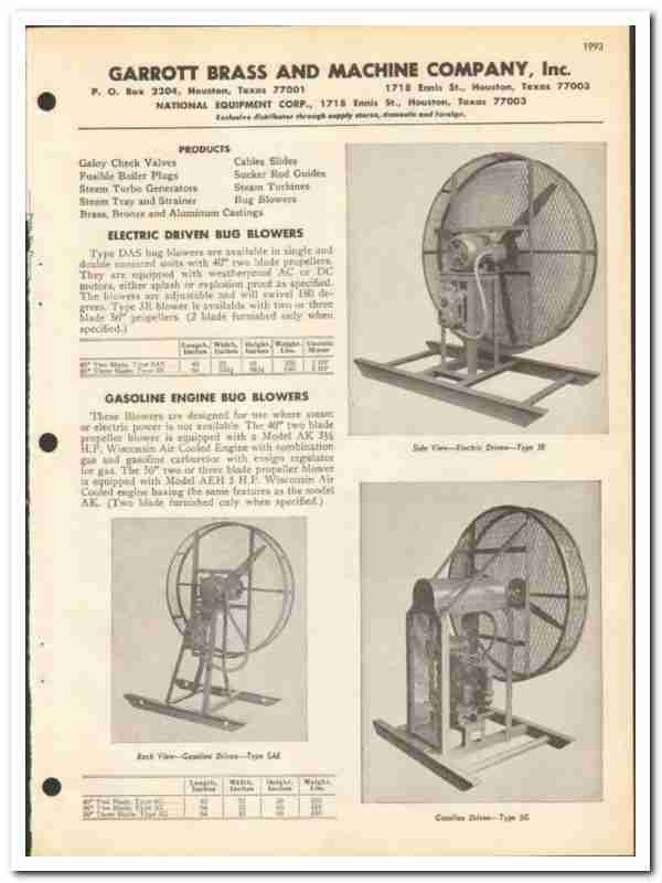 Products include Electric Driven Bug Blowers, Gasoline Engine Bug Blowers, Garrott Bug Blowers Steam or Ele3ctric Driven, Skyhook Neco-Dykes Safety Elevator for Derrickmen, Garrott Safety Cable Slide, Fusible Plugs, Garrott Bronze Check Valves and Garrott Sucker Rod Guides, all are fully featured.