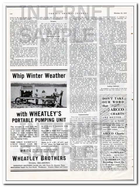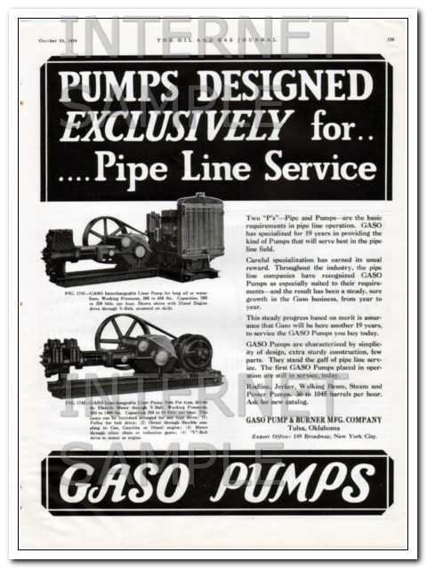 Original oil and gas trade magazine vintage ad for GASO PUMP & BURNER MANUFACTURING COMPANY of Tulsa, OK. Pumps Designed Exclusively for Pipe Line Service. Unique 1934 old oilfield petroleum pipeline industry equipment magazine advertisement would look fantastic matted and framed. On the reverse side is a fractional page ad for WHEATLEY BROTHERS of Tulsa, OK. Whip Winter Weather with Wheatley's Portable Pumping Unit.
