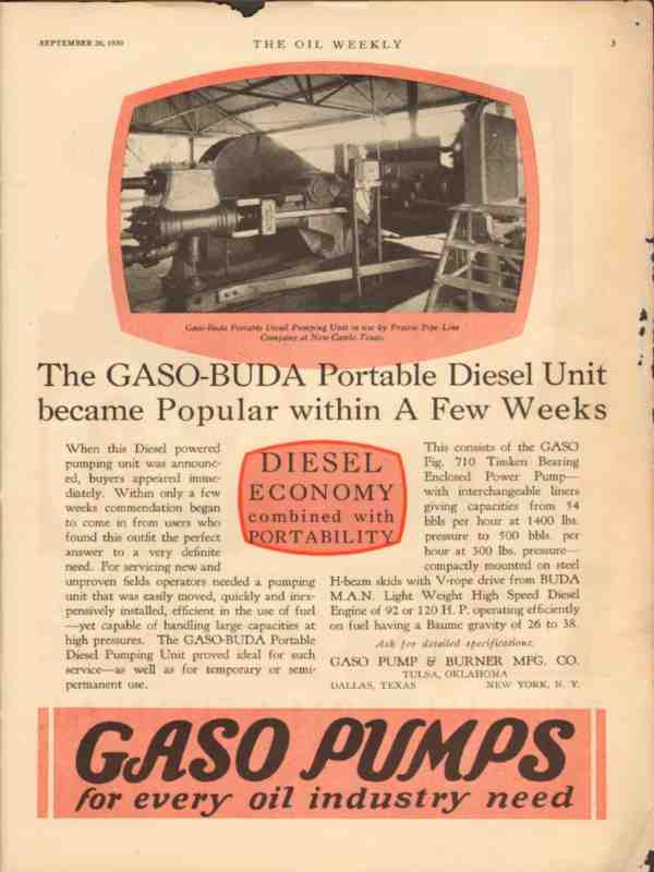 Original oil and gas trade magazine vintage ad for GASO PUMP & BURNER MANUFACTURING COMPANY of Tulsa, OK. The GASO BUDA Portable Diesel Unit Became Popular within A Few Weeks. Timken Bearing, Enclosed Power Pump. Unique 1930 old oilfield petroleum pump industry equipment magazine advertisement.