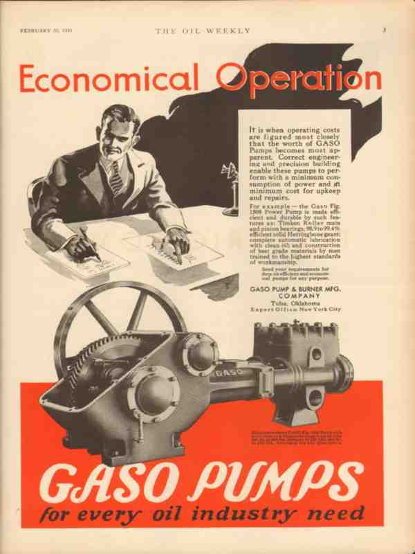 Original oil and gas trade magazine vintage ad for GASO PUMP & BURNER MANUFACTURING COMPANY of Tulsa, OK. Economical Operation. Correct engineering and precision building enable these pumps to perform with a minimum consumption of power and at minimum cost for upkeep and repairs. This unique 1931 old oilfield petroleum well pumping equipment magazine advertisement would display beautifully matted and framed. Nice graphics.