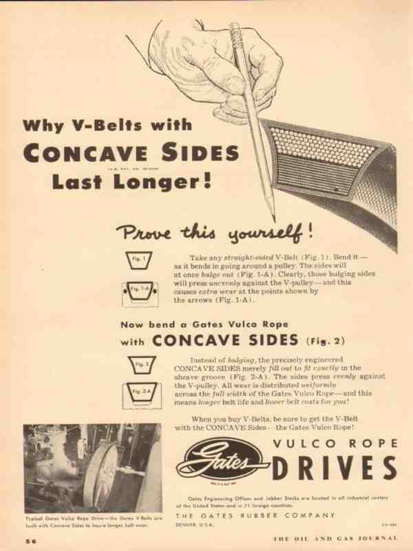 Original vintage oil and gas trade magazine ad for THE GATES RUBBER COMPANY of Denver, CO. V-Belts with Concave Sides Last Longer! Gates Vulco Rope. Old 1954 petroleum industry oilfield and refinery advertisement.