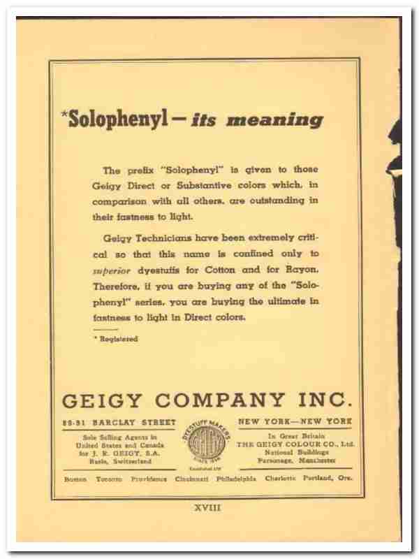 The prefix Solophenyl is given to those Geigy Direct or Substantive colors which, in comparison with all others, are outstanding in their fastness to light. Superior dyestuffs for cotton and for rayon.