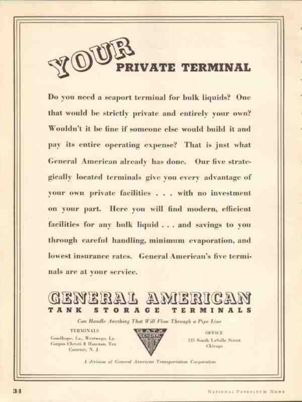 Original oil and gas trade magazine vintage ad for GENERAL AMERICAN TRANSPORTATION CORPORATION. Main office and factory was located in Chicago, IL. Private Terminal. Tank Storage Terminals Can Handle Anything That Will Flow Through a Pipe Line. This unique 1937 old petroleum products storage industry magazine advertisement would display beautifully matted and framed.
