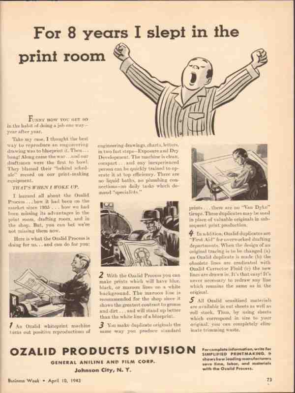 Original World War 2 business industry trade magazine vintage ad for GENERAL ANILINE FILM CORPORATION. Main office and factory was located in Johnson City, NY. For 8 Years I Slept in the Print Room. Ozalid Products Division. That's When I Woke Up. Use the Ozalid Process for reproductions of engineering drawings, charts, letters. Old 1943 WW2 era magazine advertisement.