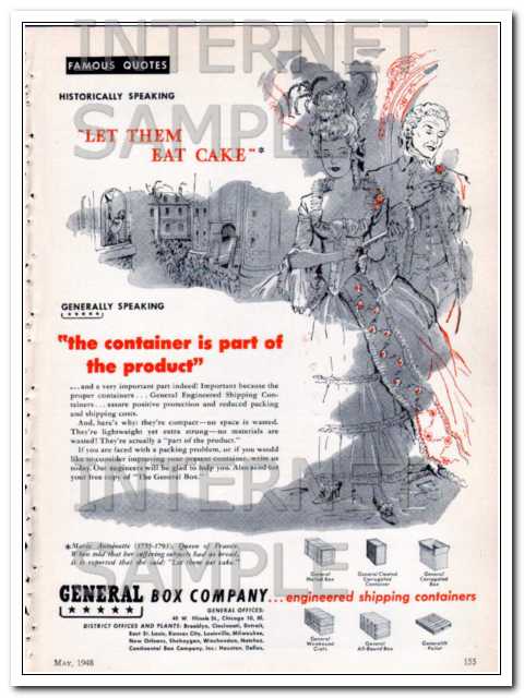 Original vintage industrial magazine ad for GENERAL BOX COMPANY OF Chicago, IL . Let Them Eat Cake Generally Speaking The Container is Part of The Product. Marie Antoinette Shipping Container ad. General nailed box, corrugated box, wirebound crate. Old dated 1948 container industry advertisement. Would display magnificently matted and framed!