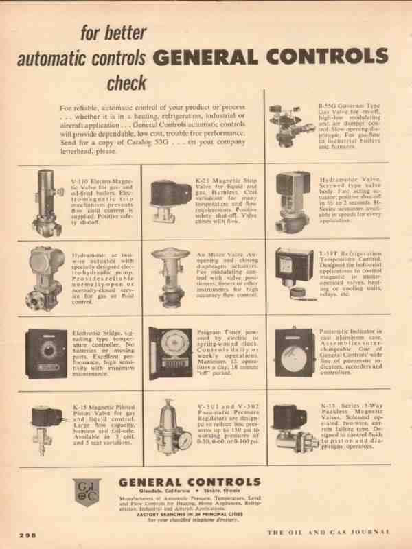 Original oil and gas trade magazine vintage ad for GENERAL CONTROLS INC, of Glendale, CA. For Better Automatic Controls Check General Controls. Manufacturers of Automatic Pressure, Temperature, Level and Flow Controls for Heating, Refrigeration, Industrial and Aircraft Applications. Unique 1954 old petroleum refinery process equipment magazine advertisement.