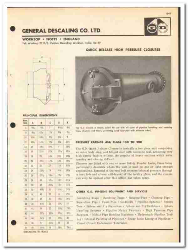 Products include Quick Release High Pressure Closures. The G.D. Closure is ideally suited for use with all types of pipeline launching and receiving traps, strainers and filters, permitting quick operation with minimum effort. Full featured.