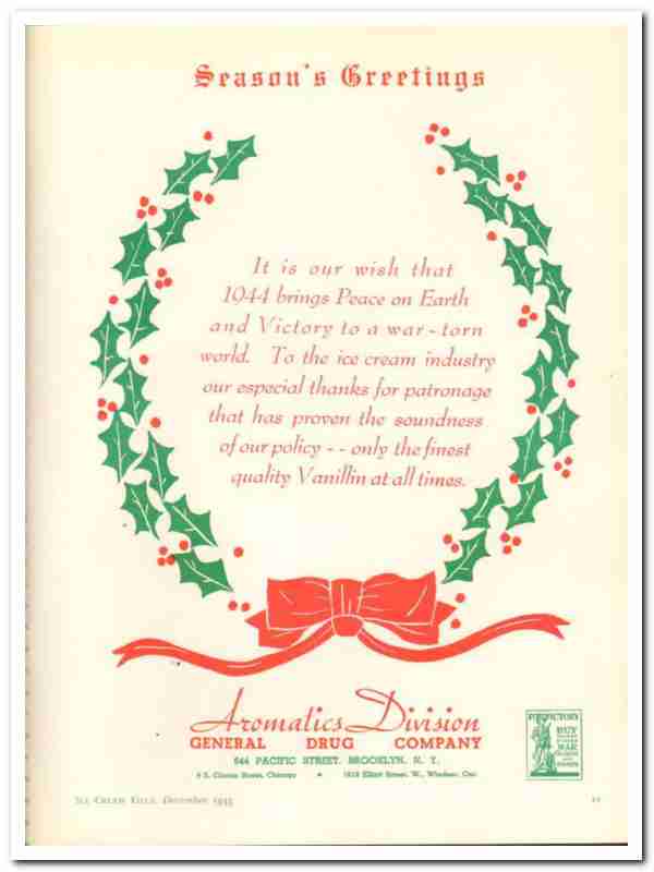 It is our wish that 1944 brings Peace on Earth and Victory to a war-torn world. To the ice cream industry our especial thanks for patronage that has proven the soudness of our policy - only the finest quality Vanillin at all times.