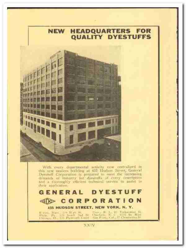 With every departmental activity now centralized in this new modern building at 435 Hudson Street, General Dyestuff Corporation is prepared to meet the increasing demands of industry for dyestuffs of every description and a thoroughly efficient technical service to assist in their application.