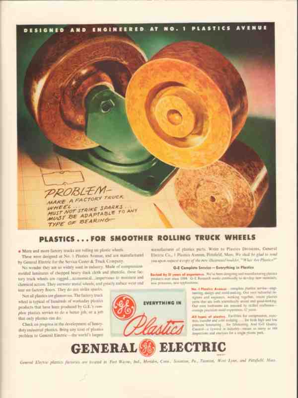 Original old industrial trade magazine ad for GENERAL ELECTRIC COMPANY of Pittsfield, MA. Plastics for Smoother Rolling Truck Wheels. More and more factory trucks are rolling on plastic wheels. This 1947 magazine advertisement would display beautifully matted and framed.