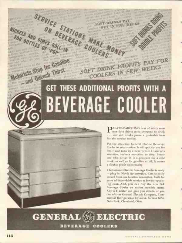 Original old retail service station trade magazine vintage ad for GENERAL ELECTRIC COMPANY of Cleveland, OH. Additional Profits with a GE Beverage Cooler. It attracts attention, induces motorists to stop. This unique 1937 petroleum, commercial refrigeration industry advertisement would display beautifully matted and framed.