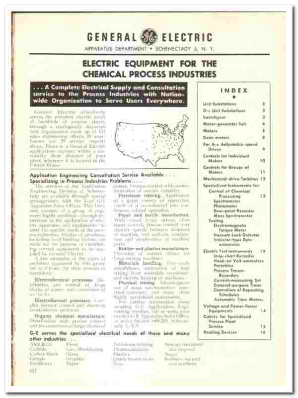 Products include Unit Substations, DC Unit Substations, Switch Gear, Motor-Generator Sets, Motors, Gear-Motors, AC Adjustable Speed Drives, Controls for Individual Motors, Controls for Groups of Motors, Mechanical-Drive Turbines, Specialized Instruments for Chemical Processing, Spectrometer, Photometer, Dew Point Recorder, Mass Spectrometer, Vacuum Leak Detector, Electromagnetic Torque Meter, Induction Type Dynamometer, Electric Test Instruments , Voltage & Power Factor Equipment and Heating Devices; all are fully featured.