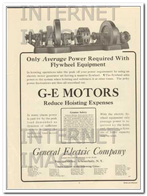 Original vintage coal mining magazine ad for GENERAL ELECTRIC COMPANY of Schenectady, NY. Only Average Power Required with Flywheel Equipment. G-E Motors Reduce Hoisting Expenses. Old 1910 mine industry equipment advertisement. There is a tear on the top edge and on the left side, but the ad will matte and frame beautifully.